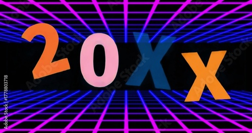 Naklejka premium Floating four 3D alphanumeric characters in retro digital scene, with neon...