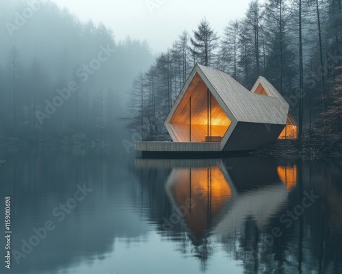 © Dreamy Shots, Fototapeta premium Floating geometric pavilion on a tranquil lake in a misty forest high-resolution architectural photography