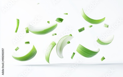 Fototapeta premium Floating Green Onion Slices Isolated on White Background Generative AI