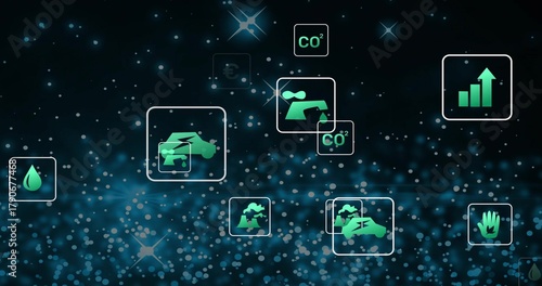 Obraz premium Floating green tile cluster moving across teal dashboard, with electric car, CO2, water, chart