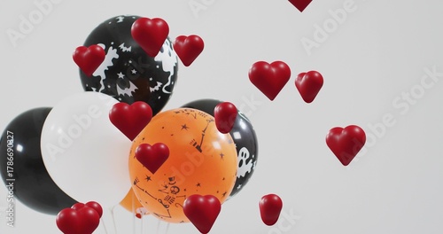 © vectorfusionart, Obraz premium Floating Halloween balloon cluster in gray studio, showing skull prints, red hearts, copy space