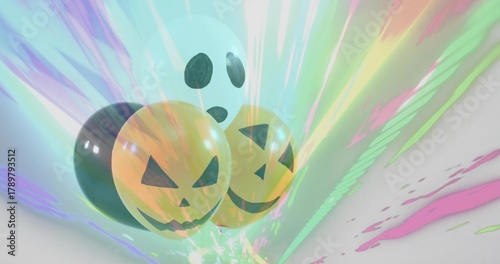Fototapeta premium Floating Halloween balloons showing two orange pumpkin faces and white ghost...