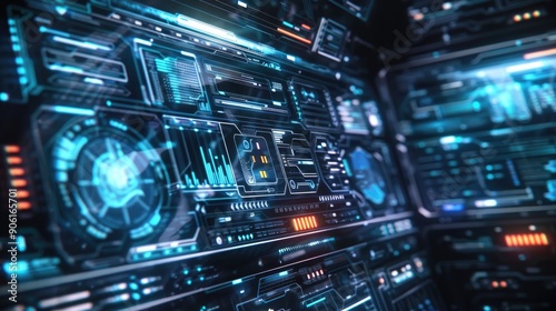 © mon, Fototapeta premium Floating holographic interfaces in a dark room