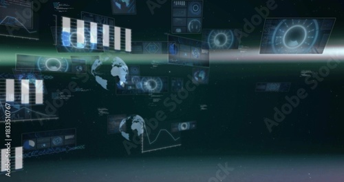 Fototapeta premium Floating holographic UI panels hovering above planetary horizon, displaying globes, charts, radars