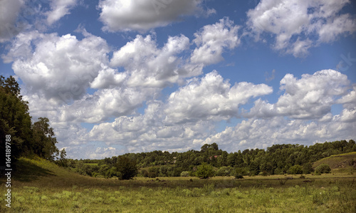 © Viktor, Fototapeta premium Floating in the blue sky, large clouds over the meadow.
