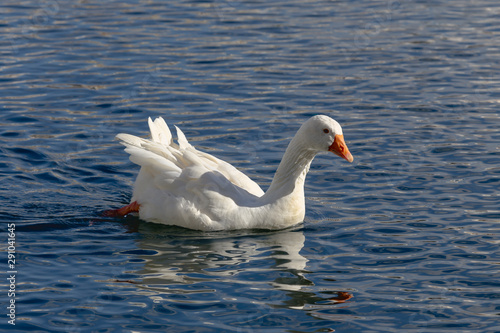 Obraz premium Floating in the pond white goose on a sunny day close-up.