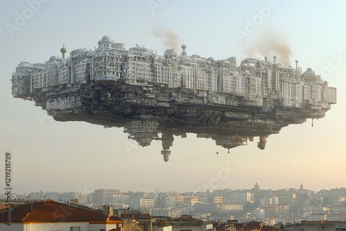 © Kateryna, Fototapeta premium Floating industrial city above a modern skyline during golden hour