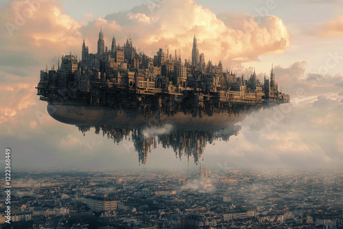 © Oleksandr, Naklejka premium Floating industrial city above a modern skyline during golden hour