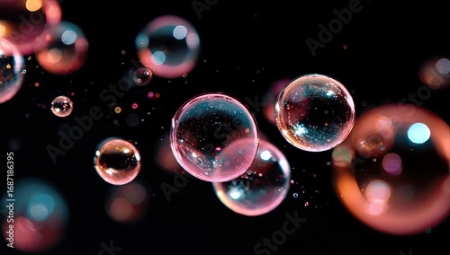 © fumakilla, Naklejka premium Floating iridescent bubbles in a dark background