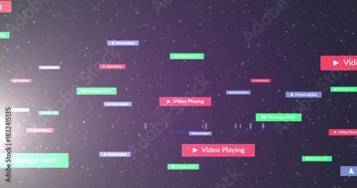 Fototapeta premium Floating label cluster drifting in virtual space, with red play green message...