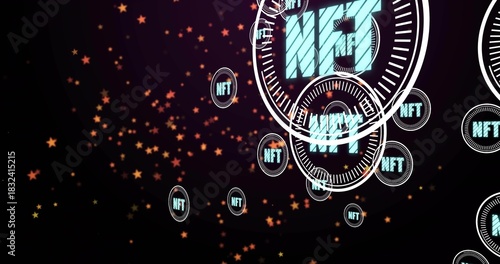 Obraz premium Floating large NFT token at right edge drifting through virtual space with orange stars, copy space