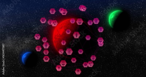 © vectorfusionart, Naklejka premium Floating large red planet displaying pink hexagons with icons in starfield, with green blue planets