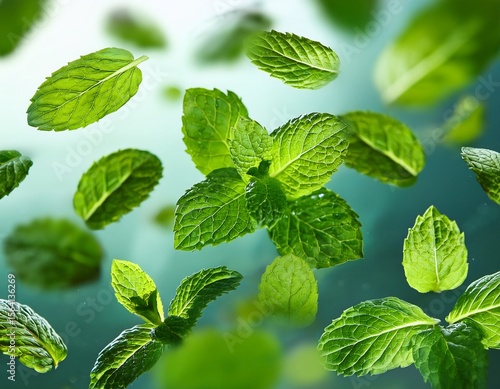 © Ina, Naklejka premium floating mint leaves in soft focus