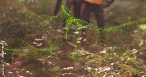 © vectorfusionart, Fototapeta premium Floating neon green digital mesh wave weaving above forest floor, with ferns, leaves, hiking boots