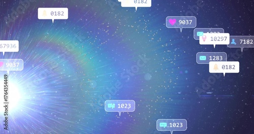 Fototapeta premium Floating notification bubbles showing heart chat envelope user bell icon counts in cosmic space