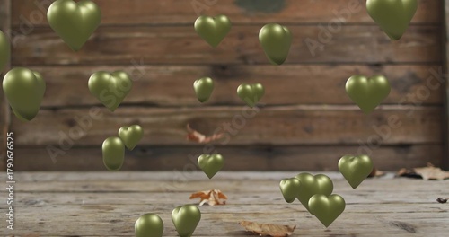 Naklejka premium Floating olive-green heart-shaped metallic balloons with plank wall, wooden floor, dry leaves