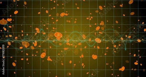 Obraz premium Floating orange tokens with dollar symbols, cyan, yellow waveforms drifting across olive green grid