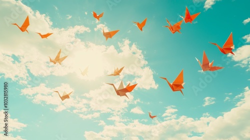 Fototapeta premium Floating origami cranes flying through a bright blue sky filled with clouds.