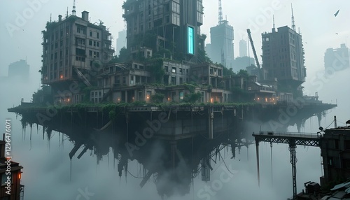 © Dwi, Naklejka premium Floating Post-Apocalyptic City with Crumbling Skyscrapers and Fading Neon Lights