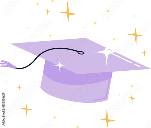 © vectorfusionart, Fototapeta premium Floating purple tasseled mortarboard on flat transparent scene shining gold-white stars, copy space