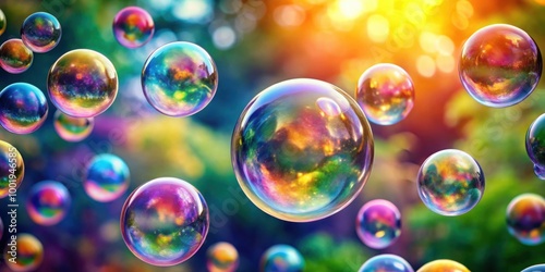 © Nasnunt, Naklejka premium Floating rainbow soap bubbles on background, soap bubbles, rainbow, floating, isolated,vibrant colors, iridescent, shiny