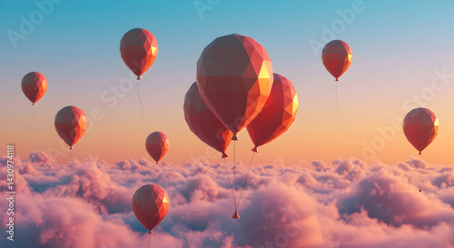 © Tia, Obraz premium Floating Red Balloons Above Dreamy Pink Clouds on Golden Sky Backdrop