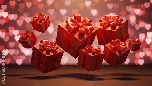 © kaowsar, Obraz premium Floating red gift boxes with heart bokeh background