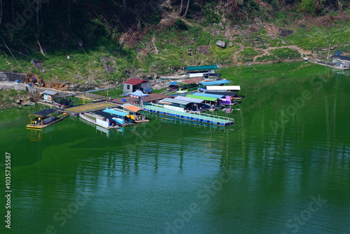 Fototapeta premium floating restaurant complex on Telaga Menjer, Wonosobo.