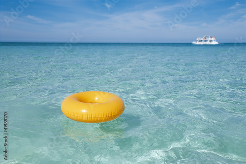 © Elena Moiseeva, Naklejka premium floating ring on blue clear sea with white boat, shallow dof