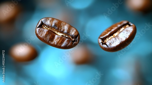 © Anusa, Obraz premium Floating Roasted Coffee Beans in Motion on Blurred Blue Background