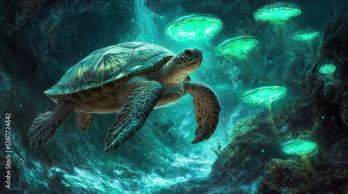 Fototapeta premium Floating Sea Turtle in a Glowing Underwater Realm