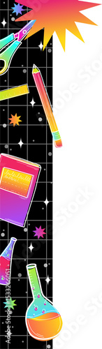 © vectorfusionart, Naklejka premium Floating stationery or lab icons over black grid with rainbow gradient stars on transparent backgrou