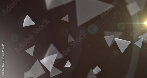 © vectorfusionart, Obraz premium Floating translucent triangular prisms and flat planes forming depth in dark studio with lens flare