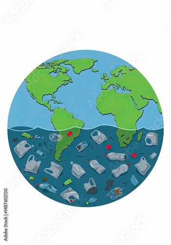 © Olesya, Naklejka premium Floating trash and plastic pollution contaminating the ocean around the world globe on a white background, a global crisis concept for world oceans day.