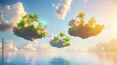 © pinyapat, Fototapeta premium Floating tropical islands under a bright sky nature illustration calm waters serene environment dreamlike scene