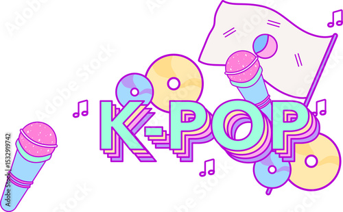 Fototapeta premium Floating vector is showing 3D K-POP text with microphones, CDs, flag and...