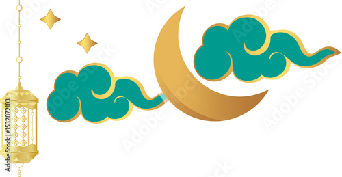 Naklejka premium Floating vector night motif with gold moon, lantern amid green clouds and stars on clear backdrop