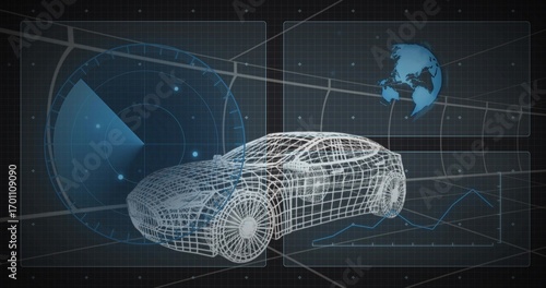© vectorfusionart, Obraz premium Floating wireframe car model over gray grid workspace, with radar HUD, globe and line-chart panel