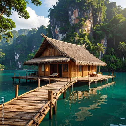 © Alan, Fototapeta premium Floating wooden and bamboo house designed for sustainable living on water with natural, eco-friendly materials.