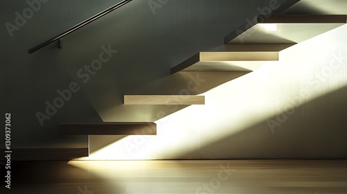 © Mrs. Studio, Obraz premium Floating Wooden Staircase with Sunlight Creates Abstract Modern Interior Design