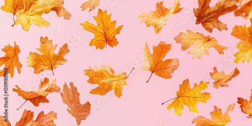 © Marina, Obraz premium Floating yellow autumn oak leaves on a pastel pink background