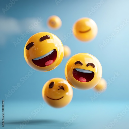 Fototapeta premium Floating Yellow Emojis on Blue – Realistic World Emoji Day Set