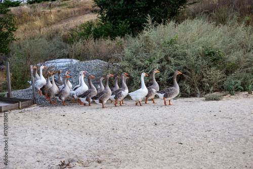 © Наталія Богодіца, Fototapeta premium flock, gray geese, standing on sand, river bank, large domestic birds, pink beaks, cawing, large bushes, thickets, greenery, dinner, stones, picturesque nature, wildlife