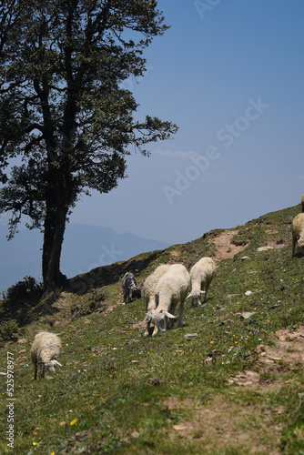© Navaashay, Fototapeta premium Flock grazing at high altitude hilly grassland area of himachal pradesh
