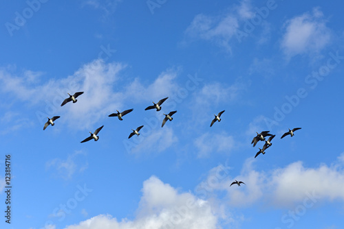 Fototapeta premium Flock of Barnacle geese (Branta leucopsis) flying in blue sky