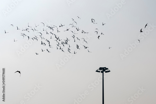© tripper13, Fototapeta premium Flock of birds around tall street lamp.