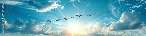 © Oksana, Obraz premium Flock of birds flying across a bright sky with sunbeams and clouds.