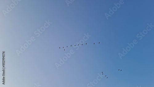 © Memory, Obraz premium flock of birds flying in formation against clear blue sky