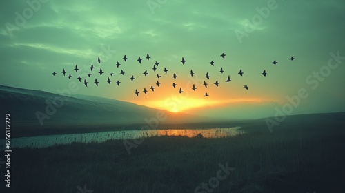 © Ika, Obraz premium Flock of birds flying over a river valley at sunset