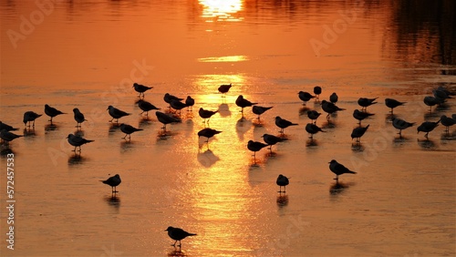 © moreidea, Fototapeta premium Flock of birds on frozen lake in beautiful sunset